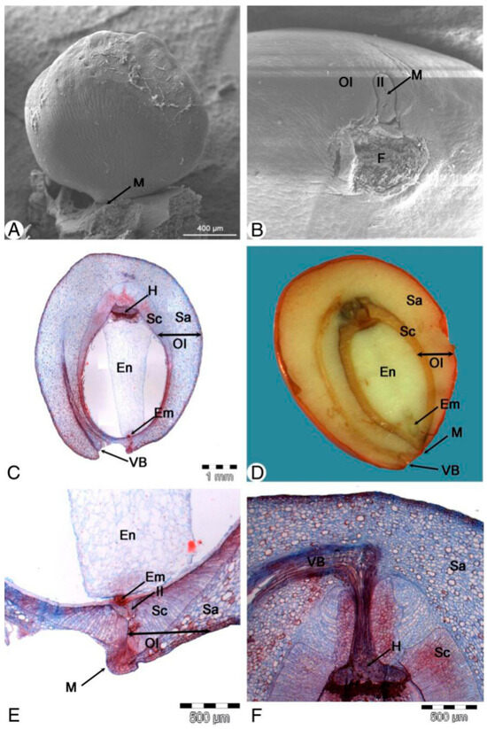Seed morphology and anatomy of Magnolia stellata. (A)—a mature ovule; (B)—a micropyle of (A); (C)—the longitudinal section of the seed with an embryo; (D)—the hand cutting of a seed after stage (C); (E)—magnification of the micropyle portion of (C) to show the inner integument tissue left on the micropyle and outer integument that has developed into a sarcotesta and sclerotesta; (F)—the chalaza portion of (C) to show the vascular bundle and hypostase. Em—embryo; En—endosperm; H—hypostase; F—funiculus; II—inner integument; M—micropyle; OI—outer integument; Sa—sarcotesta; Sc—sclerotesta; VB—vascular bundle.