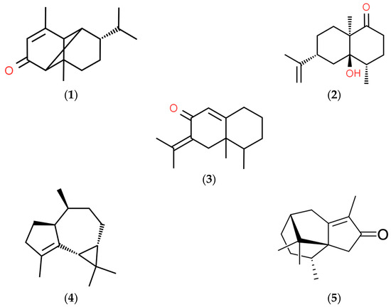 The main volatile constituents identified in the ethanolic extracts from C. articulatus (rhizomes and solid waste) were (1) mustakone, (2) corymbolone, (3) dehydrofukinone, (4) gurjunene, and (5) cyperotundone (Figure 1).