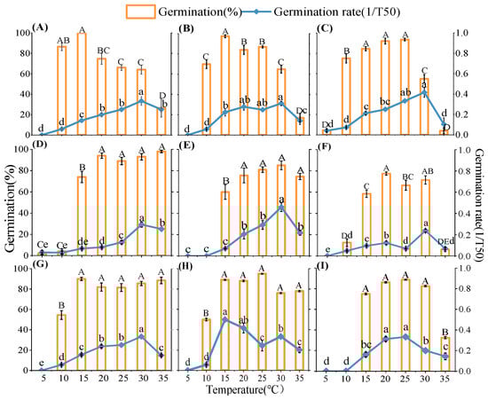 Percentage and rate (1/T50) of seed germination in nine species at seven different temperatures. Different uppercase letters indicate that germination percentage differed significantly (p < 0.05) between temperature treatments; Different lowercase letters indicate that germination rate (1/T50) differed significantly (p < 0.05) between temperature treatments; (A) Artemisia scoparia, (B) Artemisia giraldii, (C) Artemisia sacrorum, (D) Periploca sepium, (E) Bothriochloa ischaemum, (F) Patrinia scabiosifolia, (G) Linum usitSatissimum, (H) Lespedeza davurica, (I) Sophora davidii.
