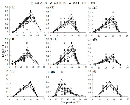Linear regression of temperatures and percentages of germination (1/tg) in nine species at various percentiles where tg is the time to reach a specific germination percentage (d); (A) Artemisia scoparia, (B) Artemisia giraldii, (C) Artemisia sacrorum, (D) Periploca sepium, (E) Bothriochloa ischaemum, (F) Patrinia scabiosifolia, (G) Linum usitatissimum, (H) Lespedeza davurica, (I) Sophora davidii.