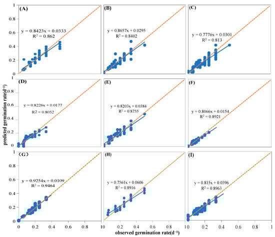 Linear fit of observed and predicted germination rates of nine species. The blue line represents the fitted trend line of the observed germination rates to the predicted germination rates; the dots represent the predicted germination rates (predicted by the thermal time model) for various observed germination rates. (A) Artemisia scoparia, (B) Artemisia giraldii, (C) Artemisia sacrorum, (D) Periploca sepium, (E) Bothriochloa ischaemum, (F) Patrinia scabiosifolia (G) Linum usitatissimum, (H) Lespedeza davurica, (I) Sophora davidii.