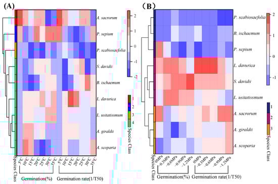 The clustering analysis of germination percentages and rates (1/T50) under different treatments among nine species; (A) germination percentages and rates (1/T50) for temperature treatments; (B) germination percentages and rates (1/T50) for water potential treatments.