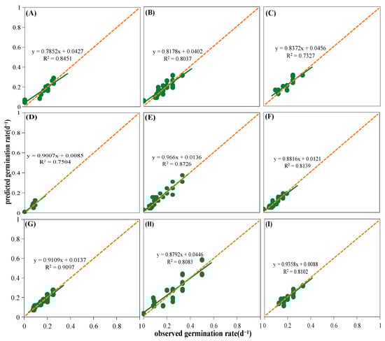 Linear fit of observed and predicted germination rates of nine species. The green line represents the fitted trend line of the observed germination rates to the predicted germination rates; the dots represent the predicted germination rates (predicted by the hydrotime model) for various observed germination rates. (A) Artemisia scoparia, (B) Artemisia giraldii, (C) Artemisia sacrorum, (D) Periploca sepium, (E) Bothriochloa ischaemum, (F) Patrinia scabiosifolia, (G) Linum usitatissimum, (H) Lespedeza davurica, (I) Sophora davidii.