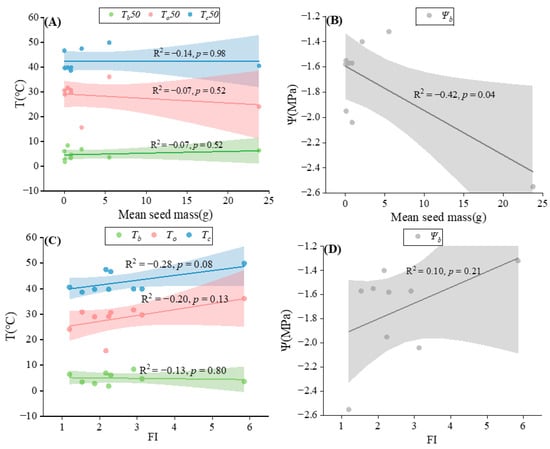 Linear fit of mean seed mass and flatness index (FI) of temperature thresholds, and water potential thresholds for nine species. (A) Mean seed mass and temperature thresholds; (B) mean seed mass and water potential thresholds; (C) FI and temperature thresholds; (D) FI and water potential thresholds.