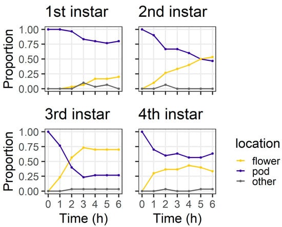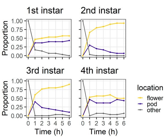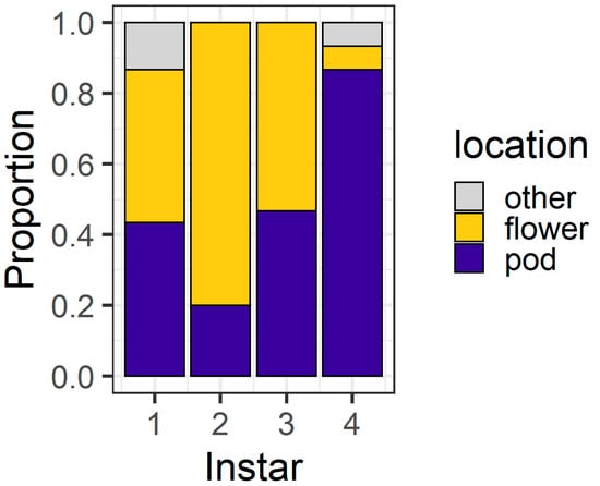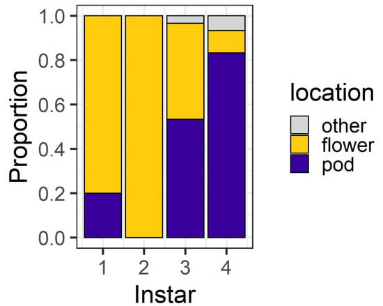 At 24 h, the larval instar again affected location (χ2 = 56.04, df = 3, p < 0.001) (Figure 4), with 80% of first instars and all second instars located on flowers. Third instars were evenly distributed between flowers (43%) and pods (53%), but most (83%) fourth instars were found on pods. At 24 h, only three larvae (two fourth instars and a single third instar) were located on the filter paper rather than on the plant structures.