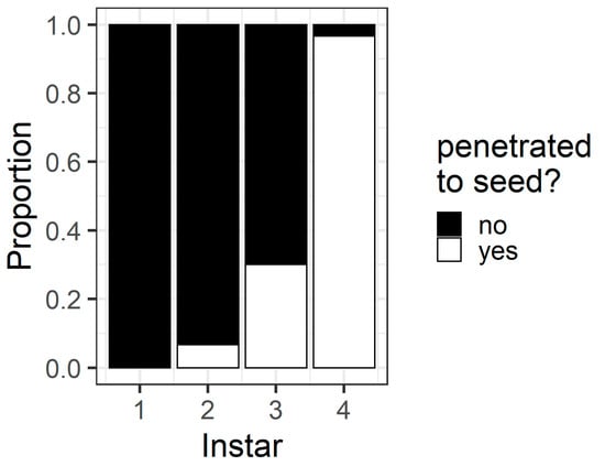Proportion of larvae of different instars that penetrated the pod wall through to the seed within 24 h in the pod avoidance experiment. The white bars indicate the proportion of larvae that did penetrate through to the seed, and the black bars indicate the proportion of larvae that did not penetrate through to the seed.
