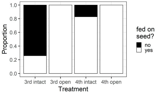 Proportion of larvae of different instars that fed on pigeonpea seeds during the older instar pod feeding experiment. All larvae in the open treatment fed on the seed as they did not have to bore through the pod wall. However, larvae in the intact treatment had to chew through the pod wall to feed on seeds.
