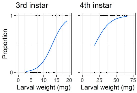 Logistic regressions for feeding on seed in the older instar pod feeding experiment, only for larvae in the control treatment where they had to chew through the pod wall to feed on seed. The y-axis represents success/failure whether a larva managed to feed on seed, 1 = fed on seed and 0 = did not feed on seed. The x-axis is the larval weight at the start of the experiment; note the different scale between third and fourth instars on the x-axis.