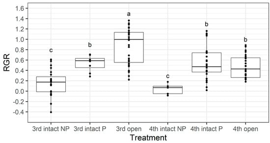 Larval relative growth rate (RGR) from the older instar pod feeding assay. NP = larvae did not penetrate the pod through to the seed, whereas P = larvae penetrated though the pod through to the seed. The box indicates the interquartile range, the horizontal line is the median, and individual data points are shown with black dots. Different letters indicate a significant difference according to Fisher’s LSD test. Untransformed values are presented; however, square-root transformed values were used for analysis.