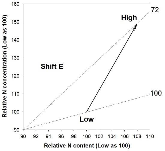 Vector analysis of synthesized relative N content (x-axis), N concentration (y-axis), and biomass (end of dashed line) in shoots of Podocarpus macrophyllus seedlings subjected to ENL at high-rate N application (120 mg N seedling−1) relative to those at low rate (40 mg N seedling−1). Nomograph vectors indicate a relative nutritional state of toxic accumulation (Shift E) diagnosed possibly by relative excess N supply [22].