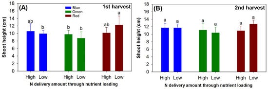 Shoot height in transplanted Podocarpus macrophyllus seedlings precultured with ENL at high (120 mg N seedling−1) and low rates (40 mg N seedling−1) of N application and subjected to different light-emitting diode (LED) spectra in red, green, and blue colors in both harvests (1st harvest, (A); 2nd harvest, (B)). Error bars present standard errors, above which are lowercase letters indicating significant difference identified using Tukey test at 0.05 level.