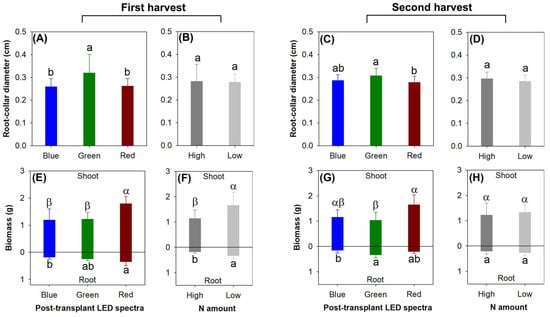 In the first harvest, either the current light spectra or the preculture N delivery rate generated the main effects on the biomass in the shoot (Light, F = 4.05, p = 0.0453; N, F = 7.22, p = 0.0198) and root parts (Light, F = 7.48, p = 0.0078; N, F = 15.64, p = 0.0019) (Figure 3E,F). Among the three types of LED light spectra, the red light spectrum led to greater biomass relative to the blue light spectrum in both the shoot and root parts, and the shoot biomass was also greater in the red light spectrum compared with that in the green light spectrum (Figure 3E). The low rate of N delivery led to greater biomass in both the aboveground and belowground parts relative to the high-rate application (Figure 3F).