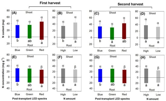 Nitrogen content (A–D) and N concentration (E–H) in Podocarpus macrophyllus seedlings exposed to current light spectra (A,C,E,G) and preculture rates of N delivery through ENL (B,D,F,H) in both harvests (1st harvest, (A); 2nd harvest, (B)). Error bars present standard errors, above which are different letters indicating significant difference identified using Tukey test at 0.05 level. Shoots are marked by different Greek letters, and roots are marked by different lowercase letters.