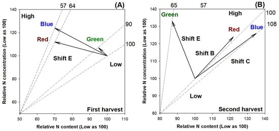 Vector analyses of synthesized relative N content (x-axis), N concentration (y-axis), and biomass (end of dashed line) in shoots of Podocarpus macrophyllus seedlings subjected to current light spectra and ENL at high rate of N application (120 mg N seedling−1) relative to those at low rate (40 mg N seedling−1) in first (A) and second harvests (B). Nomograph vectors indicate relative nutritional states. Interpretations: Shift B, steady-state uptake of N to a sufficient level; Shift C, requirement of N is limited due to the deficiency; Shift E, toxic accumulation of N caused by excess supply [22].
