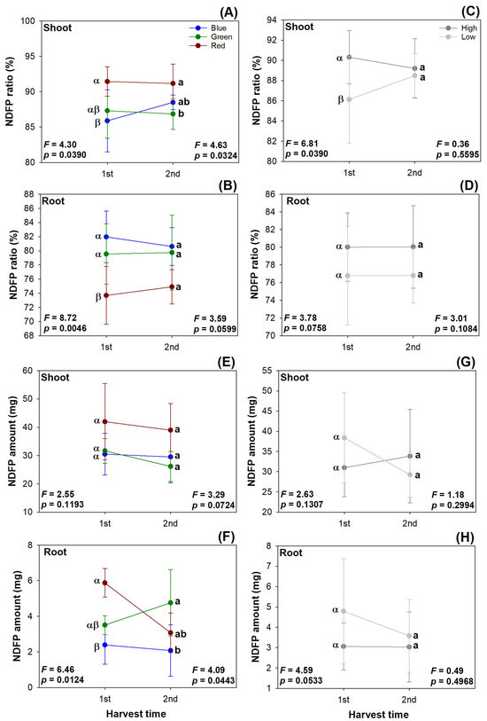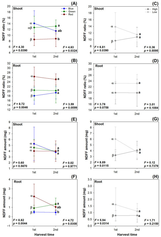 The current light spectra did not affect the shoot NDFF amount in the two harvests (Figure 6E). The root NDFF amount was increased in the red light spectrum relative to that in the green and blue light spectra in the first harvest, but the root NDFF amount was increased by the green light spectrum compared with that in the blue light spectrum in the second harvest (Figure 6F). The low rate of N delivery increased the NDFF amount in the shoots and roots compared with the high rate of N application in the first harvest, but this effect was diminished in the second harvest (Figure 6G,H).