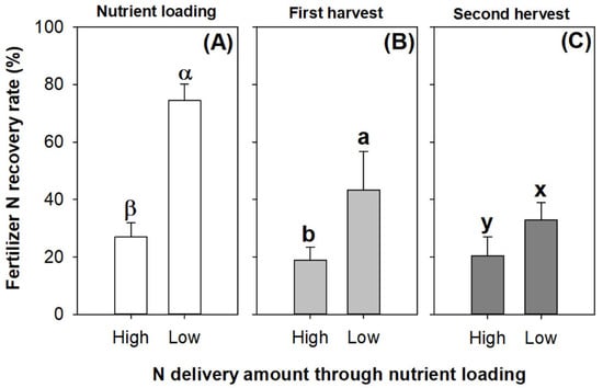 Fertilizer N recovery rates in Podocarpus macrophyllus seedlings subjected to high and low N application rates of preculture ENL (A) and post-transplantation harvests (B,C). Error bars present standard errors, above which are different letters indicating significant difference identified using Tukey test at 0.05 level. Data collected following ENL are labeled by Greek letters; data from first harvest are marked by different lowercase letters a and b; data from second harvest are marked by different lowercase letters x and y.