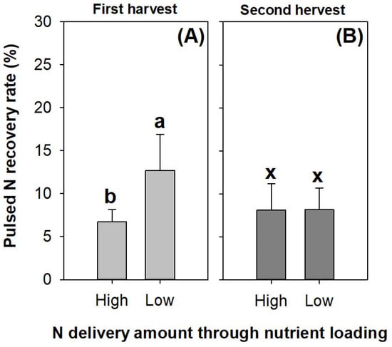 Pulsed N recovery rates in Podocarpus macrophyllus seedlings subjected to high and low N application rates of preculture ENL in both harvests (A,B). Error bars present standard errors, above which are different letters indicating significant difference identified using Tukey test at 0.05 level. Data from first harvest are marked by different lowercase letters a and b; data from second harvest are marked by different lowercase letters x and y.