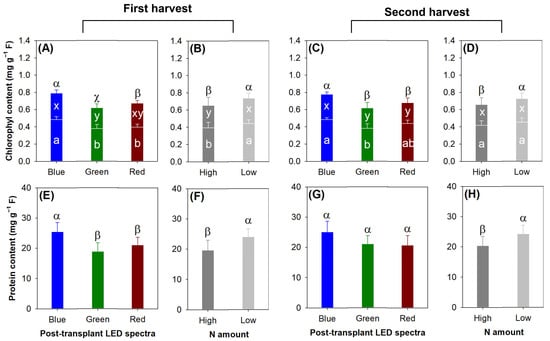 Responses of chlorophyll (a, b, a + b) content (A–D) and soluble protein content (E–H) to current light spectra (A,C,E,G) in red, green, and blue color spectra and preculture N delivery through ENL (B,D,F,H) with high and low N application rates. In cells (A–D), upper components indicate chlorophyll a content, and bottom components indicate chlorophyll b content. Error bars present standard errors. Different letters mark significant differences identified using Tukey test at 0.05 level. In cells (A–D), Greek letters mark difference in chlorophyll a + b content, lowercase letters x and y mark difference in chlorophyll a content, and lowercase letters a and b mark difference in chlorophyll b content.
