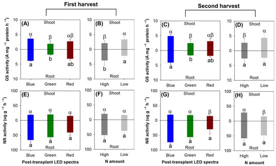 Responses of glutamine synthetase (GS) activity (A–D) and nitrate reductase (NR) activity (E–H) to current light spectra (A,C,E,G) in red, green, and blue color spectra and preculture N delivery through ENL (B,D,F,H) with high and low N application rates. Different letters mark significant differences identified using Tukey test at 0.05 level. Greek letters mark significant difference in shoot part; lowercase letters a and b mark significant difference in root part.