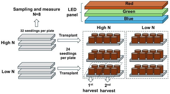 The entire process of the experimental layout and design is shown in Figure 12. The study was carried out using the random-block experimental design with two fixed factors. One factor was the rate of N delivery through ENL at the preculture stage; the other factor was the three types of light spectra simulating streetlamp light quality. A total of 32 seedlings were precultured in a planting plate, and 3 plates were arranged as 3 replicates of 1 rate measurement of the N delivery. Eight seedlings were randomly sampled at the preculture stage, leaving twenty-four seedlings for transplantation to pots. Eight pots were placed in a group exposed to one of the three light spectra, and three groups were arranged as one transplantation half-block, resulting from the twenty-four seedlings per plate during the preculture. One block comprised three groups of seedlings receiving the high-rate treatment, and the other three groups of seedlings were subjected to the low-rate treatment. Three blocks were replicated in total. Eight pots per plate were split into two random halves, with four pots in a half subjected to one of the two harvests.