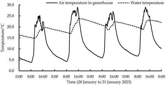The water temperature changes of the IWHS in the lettuce greenhouse during four consecutive sunny days (28 January to 31 January 2023) were selected for analysis. Figure 2 demonstrates that the minimum and maximum greenhouse indoor air temperatures during this period were 3.8 °C and 29.0 °C, respectively, and there was a period when the indoor temperature was lower than the minimum growth temperature requirement of lettuce. In the morning, the indoor air temperature rises. The IWHS water temperature gradually rises when the IWHS meets the control strategy and begins operating. The water temperature increase rate slows when the difference between the air and water temperatures decreases. The average IWHS maximum water temperature for four days was 23.2 °C, reaching the suitable water temperature for lettuce irrigation, which is 11.2 °C higher than that of unheated water. Due to normal greenhouse ventilation, the indoor temperature was above 26.0 °C for a short time at noon, and IWHS heating capacity was limited. The indoor temperature decreased as the solar radiation intensity decreased, and the system stopped operating. When the IWHS stopped, the water temperature decreased by 2.8~3.1 °C per day, indicating that the thermal insulation tank capacity was limited. The thermal insulation capacity can be improved by increasing the thermal insulation cotton thickness.