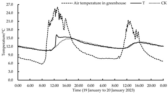 Effects of warm-water irrigation on lettuce soil temperature. T, the soil temperature in warm-water irrigation area; CK, the soil temperature in normal water irrigation area.
