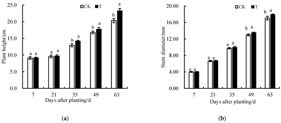 (a) Effects of warm-water irrigation on lettuce plant height of Lettuce. (b) Effects of warm-water irrigation on lettuce stem diameter. T, the experimental group plants; CK, the control group plants. Lowercase letters (a and b) indicate statistical significance by Duncan’s multiple range test (p < 0.05).