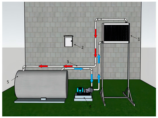 Schematic diagram of the IWHS. 1 denotes the heat exchanger comprising a fan and heat exchanger, 2 denotes the electrical control box, 3 indicates the water circulation pipe, 4 indicates the water pump, and 5 denotes the thermal insulation water storage barrel.