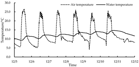 The experiment placed a polypropylene polymer (PP) bucket in the middle of the ground of the greenhouse. The bucket volume was 120 L and the bucket contained 100 L of water. The water temperature in the middle of the bucket was determined using a PT100 temperature sensor at 10 min collection intervals. The test monitored the water temperature change in the small solar water bucket (Figure 6). At a maximum indoor air temperature of 26.6 °C and minimum air temperature of 4.4 °C, the water temperature in the solar water bucket increased from the highest 11.6 °C on the first day to 14.7 °C for five consecutive days, and the average water temperature increased by 1.9 °C during the day and decreased by 1.2 °C at night. When the water temperature decreased to 11.7 °C after a cloudy day, it was only 0.1 °C higher than the highest water temperature on the first day, and the increase rate was slow; this was easily affected by low-temperature weather, and it was difficult to reach the appropriate irrigation water temperature. Simultaneously, the small amount of test water resulted in a faster heating rate, while the heating rate in the large solar water bucket was slower, and it was more difficult to meet the required irrigation requirements.