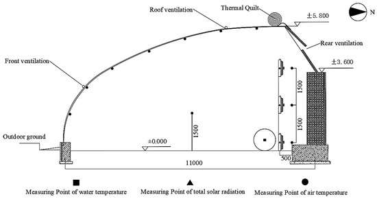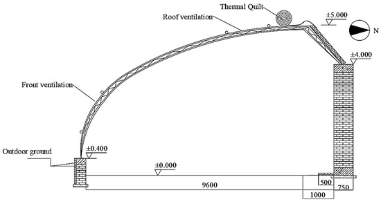 The IWHS was used to study the application of warm-water irrigation on lettuce in the Chinese solar greenhouse of Modern Agriculture Innovation Park in Yangling District, Shaanxi Province (34°30′ N, 108°03′ E) from 7 December 2022 to 7 February 2023. The greenhouse runs east–west, with a length of 48 m, clear span of 9.6 m, ridge height of 5.0 m, sinking depth of 0.4 m, and rear wall height of 4.0 m. The wall is made of clay brick masonry, and the front greenhouse roof is covered by thermal insulation at night. During the test, natural ventilation was achieved using bottom- and top-rolled film ventilation windows. The insulation was lifted at around 08:30 in the morning and dropped at around 5:00 pm. Figure 8 depicts the section diagram of the experimental greenhouse.