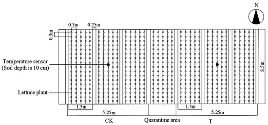 In the system application effect experiment, the test material was loose-leaf lettuce of the variety GRAND RAPIDS TBR. Three-leaf, one-core seedlings of robust growth and uniform size were selected for planting on 7 December 2022. A single cell area was 12.75 m2 (1.5 m × 8.5 m), and the plants were spaced 30 cm × 30 cm apart (Figure 9). Three cells were established in each T and CK area, and one cell was established at the junction as the quarantine area. Soil cultivation and drip irrigation were used; the irrigation strategy was artificial irrigation under sunny conditions according to weather conditions. The water temperature in the experimental group was ≥23 °C, and the management measures were the same except for the different irrigation water temperatures. According to Li et al. [40], the optimal lettuce root zone temperature is 22~25 °C. The system operation mode was set as follows: the system operated when the air and water temperature controllers detected that the air temperature and the water temperature of the water storage bucket were >26 °C and <23 °C, respectively. The water flow and hot air circulated for rapid heat exchange, and the water temperature continued to rise. The system ceased operating when the temperature controllers detected that the water temperature was >24 °C or the air temperature was <25 °C.