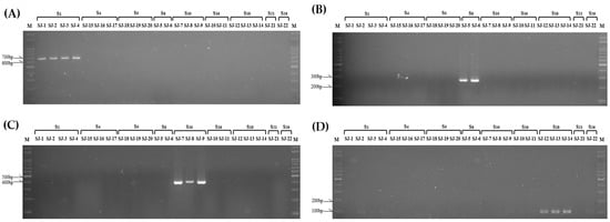 Figure 3. PCR result of 22 radish breeding lines (‘SJ-1~22’) using developed kinase domain of SRK (SRK-KD)-specific primer sets in this study. ‘S1~S26’ are the S haplotypes that each line has. (A): SRK1 (665 bp); (B): SRK8 (271 bp); (C): SRK10 (411 bp); (D): SRK18 (105 bp).
