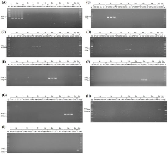 In eight radish breeding lines (‘SJ-15~22’), the class II kinase domain of SRK was amplified using the KS2 + KA2 primer combination. Additionally, class II SLG alleles were amplified with the SLG-II-F + SLG-II-R, Rs9 SLG-F + Rs9 SLG-R, and UVSLGII-F + UVSLGII-R primer combinations, resulting in a total band size of 800 to 1500 bp (Figure S2).
