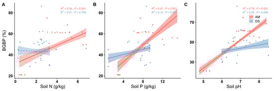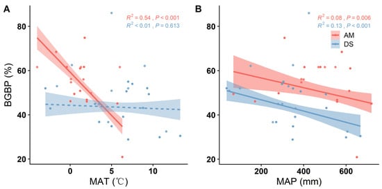 Distinct spatial disparities are evident in the BGBPs between AMs and DSs, with AMs exhibiting a significantly higher BGBP. As the mean annual temperature (MAT) increases, the BGBP of the AM significantly declines (p < 0.001) (Figure 1A). Similarly, with rising the mean annual precipitation (MAP), both the AM and DS show a significant decrease in the BGBP (p = 0.006, p < 0.001) (Figure 1B). Notably, the MAP is more effective in explaining the spatial variation in the BGBP in the DS compared to the AM, as indicated by higher R2 values (R2 = 0.13, p < 0.001; R2 = 0.08, p = 0.006) (Figure 1B).