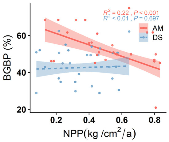 The BGBPs of both the AM and DS exhibit significant increases with rising soil P and pH (p < 0.05) (Figure 2B,C). Soil N displays a significant positive correlation with the BGBP of the AM (R2 = 0.34, p < 0.001) (Figure 2A). Among these soil factors, soil pH has the most pronounced impact on the AM’s BGBP and emerges as the primary driver of its variation (R2 = 0.78, p < 0.001) (Figure 2C). In contrast, the net primary productivity (NPP) of the AM is significantly negatively correlated with the BGBP (R2 = 0.22, p < 0.001), while the NPP in the DS does not exhibit a significant correlation with the BGBP (p > 0.05) (Figure 3).