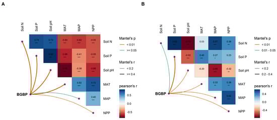 Multivariate correlation analysis of potential influencing factors in alpine meadows (A) and desert steppes (B), including climate factors (MAT and MAP), soil factors (Soil N, Soil P, and Soil pH), and net primary productivity (NPP). * p < 0.05; ** p < 0.01; *** p < 0.001.