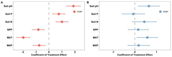 The high-level effects of each influencing factor on BGBP (belowground biomass production) in alpine meadows (A) and desert steppes (B). The numerical values represent the average effect size ± 95% confidence interval. The dotted line indicates an effect size of 0. The influencing factors are MAT, MAP, NPP, Soil N, Soil P, and Soil pH. We divided each influencing factor into two levels: high and low. The high level is the experimental group, which includes data values above the mean. The low level is the control group, which includes data values below the mean.