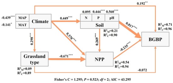 To determine whether climate and soil nutrient factors had a direct or indirect impact on BGBP through community characteristics, we created two structural equation models (SEMs) [66]. These SEMs were built using the R package “piecewiseSEM”. The models assumed that: (1) climate factors affected soil nutrient factors, and both climate factors and soil nutrient factors together affected BGBP, and (2) climate factors had a direct effect on BGBP.