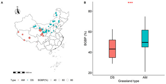 The spatial distribution and sample locations of alpine meadows (AMs) and desert steppes (DSs) in China (A). The comparison of belowground biomass production (BGBP) between alpine meadows and desert steppes is statistically significant at the 0.05 level (B). The p-value is less than 0.001 (*** p < 0.001).