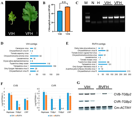 Detection of plant viruses in the field. (A) Leaf symptoms of VIH and VFH in the field. Scale bar = 0.5 cm. (B) Chlorophyll content of VIH and VFH (n = 5). (C) CVB and CVR were detected by RT-PCR (35 cycles). M, mark; N, ddH2O; H, the healthy virus-free seedling in tissue culture. (D) The number of contigs in VIH. (E) The number of contigs in RVFH. Selected with an E-value of 1 × 10−10 and a 90% match ratio of virus sequences in NCBI viral reference genome database. (F) The expression levels of CVB and CVR genes (n = 3). TGBp, triple gene block protein; CRP, cysteine-rich protein; n.d., no detection. (G) The expression levels of TGBp2 were detected by semi-quantitative RT-PCR (28 cycles). C. morifolium ACTIN (CmACTIN) was used as an internal control. Values are the mean ± SD. Student’s t test; * p < 0.05; ** p < 0.01. The primers are listed in Table S5.