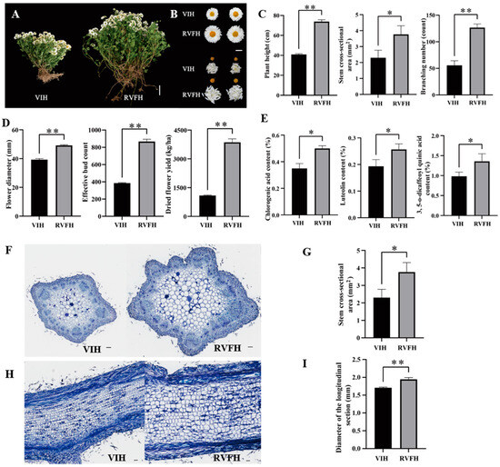 RVFH physiological responses in the field. (A) Plant phenotypes of ‘Hangju’ of VIH and RVFH. Bar = 10 cm. (B) Flower phenotypes of ‘Hangju’ of VIH and RVFH. Bar = 2 cm. (C) Growth indicators of VIH and RVFH (n = 10). (D) Growth indicators of flower (n = 20). (E) Quality-related medicine components of VIH and RVFH (n = 3). (F) Stem cross-section of VIH and RVFH. Bar = 0.1 mm. (G) Stem cross-sectional area of VIH and RVFH (n = 50). (H) Stem longitudinal section of VIH and RVFH. Bar = 0.1 mm. (I) Diameter of the longitudinal section of VIH and RVFH (n = 50). Values are the mean ± SD. Student’s t test; * p < 0.05; ** p < 0.01.