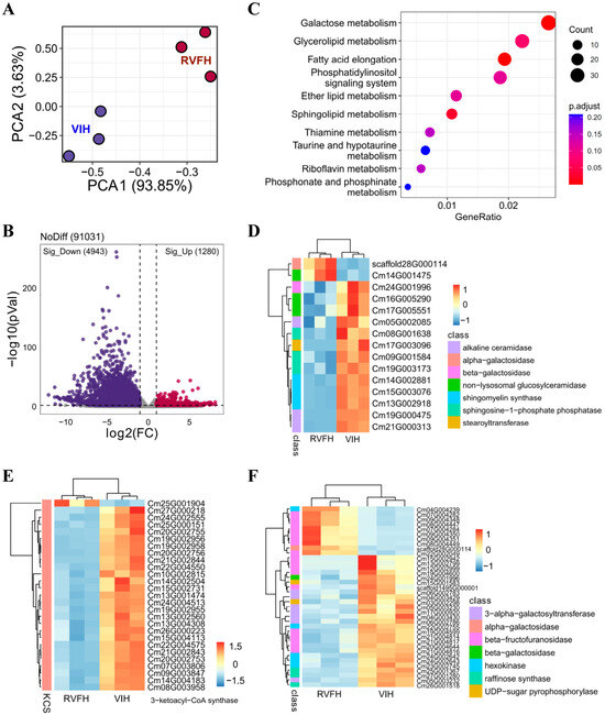 KEGG enrichment analysis of DEGs in RVFH vs. VIH plants. (A) PCA analysis of the transcriptome. (B) Volcano plot showing DEGs in RVFH vs. VIH plants. (C) Top ten enriched pathways in RVFH vs. VIH plants. The color bar represents the levels of adjusted p value. (D) Expression profiles of sphingolipid metabolism-related genes RVFH vs. VIH plants. (E) Expression profiles of fatty acid elongation-related genes RVFH vs. VIH plants. (F) Expression profiles of galactose metabolism-related genes RVFH vs. VIH plants. The color bar represents the normalization for log2-FPKM using the Pheatmap software package (v1.0.12).