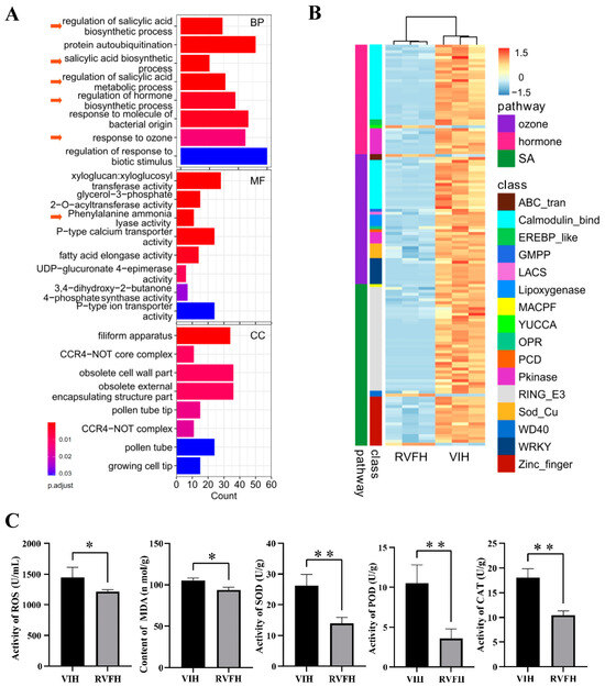 GO enrichment analysis of DEGs in RVFH vs. VIH. (A) Top eight pathways in each GO category. The color bar represents the levels of p value. BP, biological process; MF, molecular functions; CC, cellular components. The pathways related to phytohormones and superoxide were labeled with arrows. (B) Expression profiles of ozone-, hormone-, and SA-related pathway in RVFH vs. VIH. The color bar represents the normalization for log2-FPKM using the Pheatmap software package (v1.0.12). (C) The levels of ROS, MDA, SOD, POD, and CAT in RVFH and VIH (n = 5). Values are the mean ± SD. Student’s t test; * p < 0.05; ** p < 0.01.