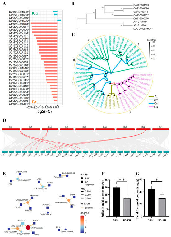 Integrated analysis of SA regulation in RVFH vs. VIH. (A) Expression profiles of ICSs and PALs. (B) Phylogenetic analysis of ICS in chrysanthemum, rice and Arabidopsis. A total of 8 ICSs were used to construct the unrooted maximum-likelihood phylogenies. (C) Phylogenetic analysis of PAL in chrysanthemum, rice, and Arabidopsis. A total of 48 PALs were used to construct the unrooted maximum-likelihood phylogenies. The 48 PALs were divided into six groups, each labeled with a letter. At, Arabidopsis; Cm, C. morifolium; Cs, C. seticuspe; Os, Oryza sativa. (D) Collinear analysis for the PALs between C. morifolium and C. seticuspe. (E) Co-expression analysis of PALs and SA-related genes in RVFH vs. VIH. The solid lines represent positive correlations. The thickness of the line is determined by a Pearson correlation coefficient > 0.9. The colors represent the correlated gene number. SA (F) and total flavonoid (G) contents in RVFH and VIH (n = 5). Values are the mean ± SD. Student’s t test; * p < 0.05; ** p < 0.01.