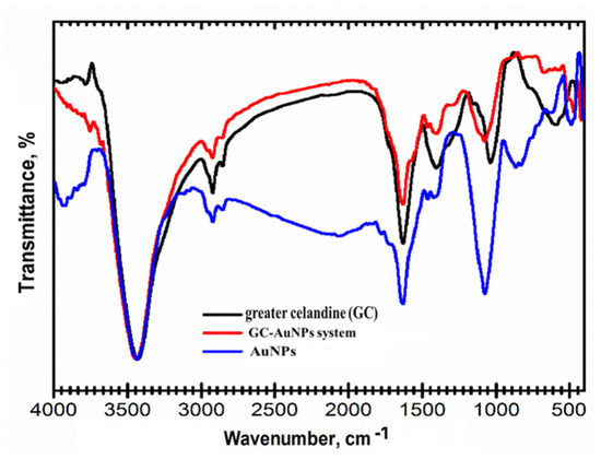 FT-IR overlap spectra of the carrier system of greater celandine, AuNPs, and GC-AuNPs.