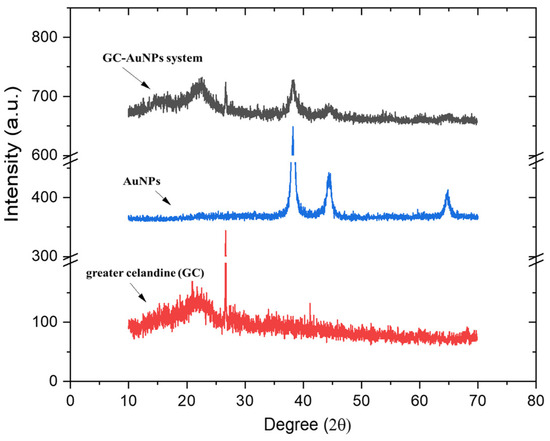 Overlapped XRD patterns of the greater celandine, AuNPs, and GC-AuNPs carrier system are presented in Figure 4.