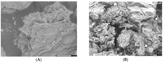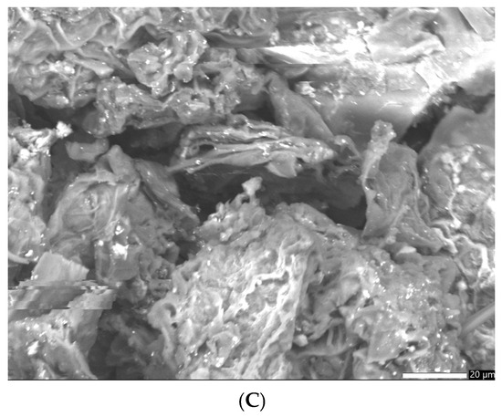 It appears that the SEM image of the greater celandine (Figure 5A, low magnification (×850)) indicates the presence of a fibrous structure with large pores and irregular shape agglomerations of different-sized particles (average size: ~30 nm). The CG-AuNPs carrier system micrograph (Figure 5B,C low magnification (×850)) indicates that AuNPs and clusters of AuNPs (spherical shape, average size ~17 nm) were loaded in the herb particle pores.