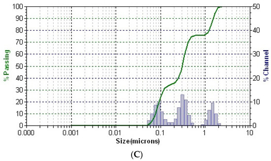 Conversely, the pattern of the CG-AuNPs carrier system (Figure 7C) exhibits three separate peaks, well-dispersed into a narrow range, indicating high stability. These peaks can be assigned to the presence of herb components (fibrous structures and particles) and AuNPs. It is worth noting that there was a significant shift in the sizes of AuNPs and herb components, which suggests that AuNPs were loaded into the herb pores. These findings agree with the results of the SEM study.