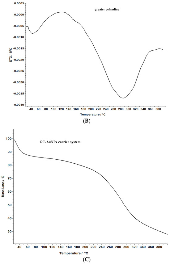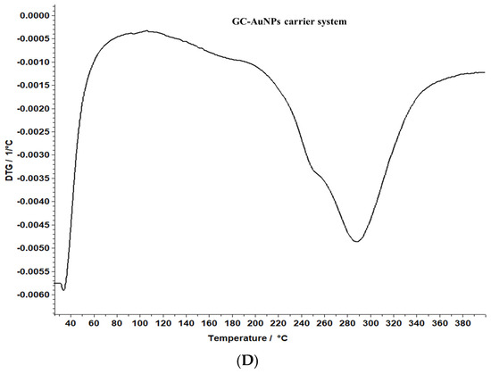 Similarly, the thermogravimetric curve of the novel carrier system indicated a noticeable weight loss (46%) at 190–220 °C, assigned to phytochemical decomposition. These changes in the differential thermogravimetric curve of the new carrier system may be linked to the loading of AuNPs in the herb particles, indicating a visible increase in the thermal stability of the CG-AuNPs carrier system. The findings provide valuable insight into the behavior of these samples, and could contribute to further research and development in this field.
