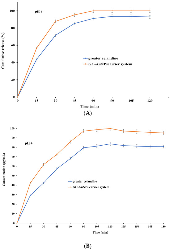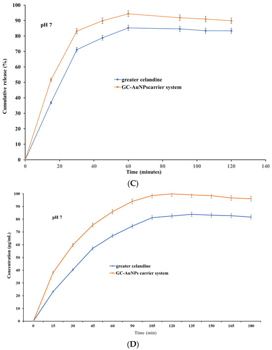 The results indicate that both samples exhibited, at pH 4, similar dissolution profiles and increased release (Figure 9 A) within 30 min (over 81% for GC and over 89% for carrier system), subsequently reaching a maximum value of 93.56% for the greater celandine (Figure 9B) and 99.99% for the CG-AuNPs carrier system at 60 min. Nevertheless, at pH 7, a notable difference appeared, specifically on the dissolution profile (Figure 9C). Furthermore, even though both samples still displayed a rapid release within 30 min, these values were significantly lower than at an acidic pH (about 71% for greater celandine and 83% for CG-AuNPs carrier system) (Figure 9D). The maximum release value was reached at 60 min for the greater celandine (85.26%) and the new carrier system (94.39%).